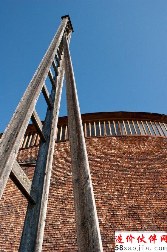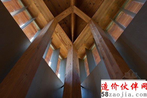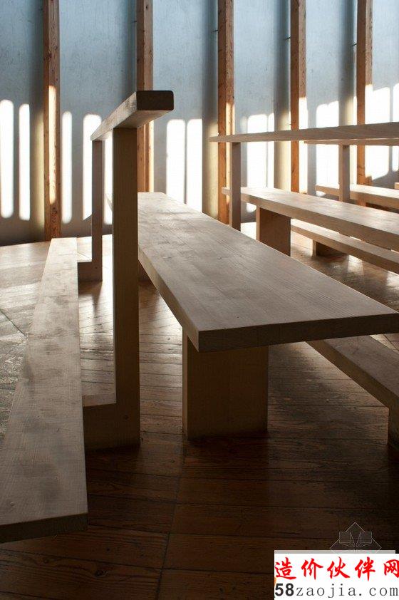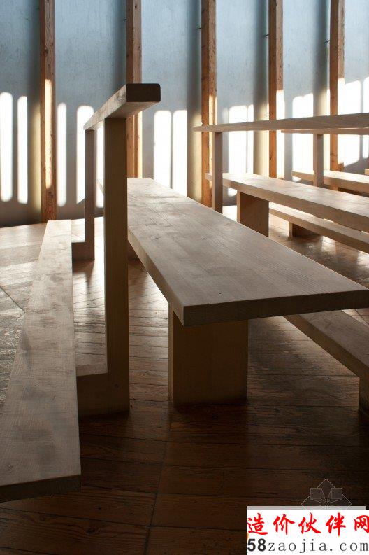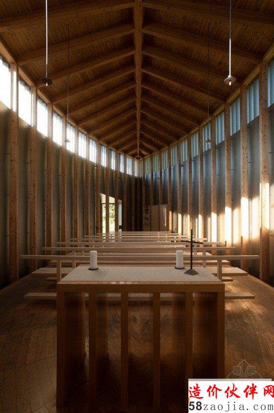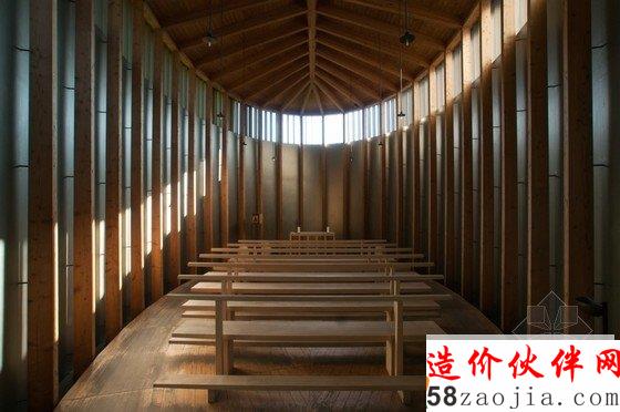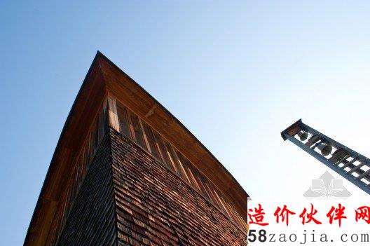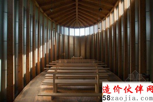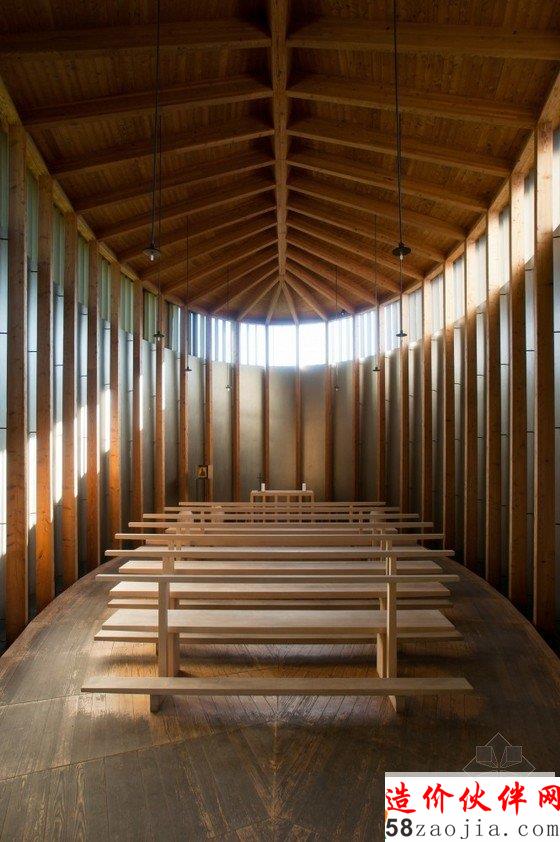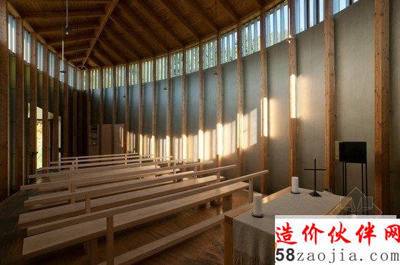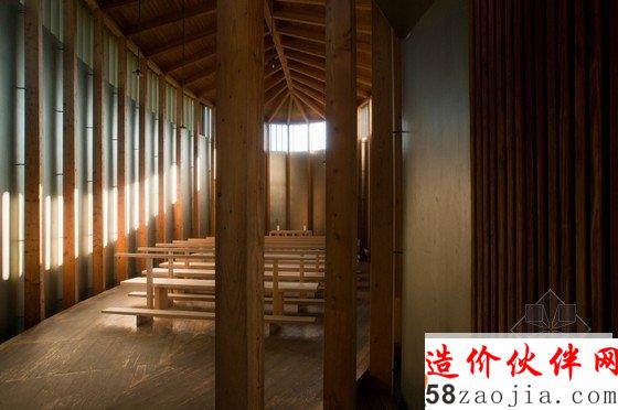 该教堂建在一座小山坡上,周围是茂密的森林,这样的山坡和森林,为教堂增添了令人惊叹的自然景色。设计师利用的是现代材料和技术,却融合了当地传统的民俗文化,教堂内部都采用木制材料,屋顶看上去有如一个船体,由简单的木柱和横梁支撑着,屋内布满木凳,看起来非常原始却别有风味。