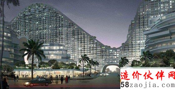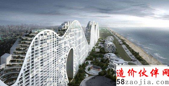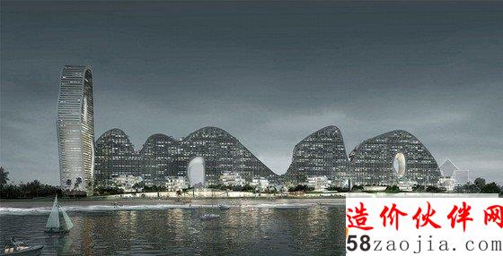 该建筑位于中国南部,长约800米,呈弯曲的几何状。整个建筑如流水一样呈现波浪态,在夜间,灯光通体,在水面上显得波光粼粼。由于其丘陵的形状,建筑的屋顶就被连在一起,设计师在上面设置了公共场所,如花园、网球场和游泳池。不仅在外观上设计师费劲心思,在建筑内部,设计师设计的独特的窗口和门径,也让人们感受到微微拂动的海风,在最好的角度欣赏到美丽的海洋景色。