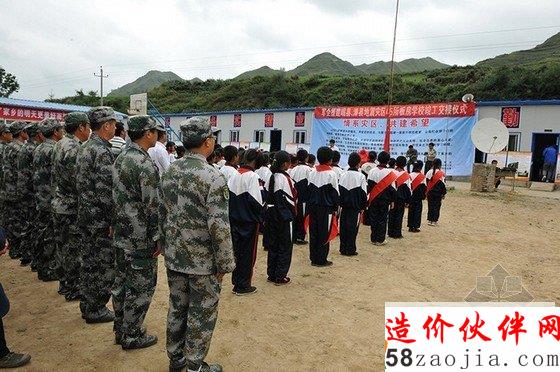 7月22日,甘肃岷县漳县发生6.6级地震,300多所学校有230所学校遭到破坏,其中95所受损严重,包括教学器材、课桌凳等在内的近万件教学设施不能继续使用,近万名学生上课没有教室。为了让灾区学生秋季开学不受影响,甘肃省军区积极协调甘肃东荣公司和甘肃昊鼎建筑装饰工程有限公司两家企业,为灾区无偿援建45所板房学校,其中援建岷县板房小学40所、漳县5所 。