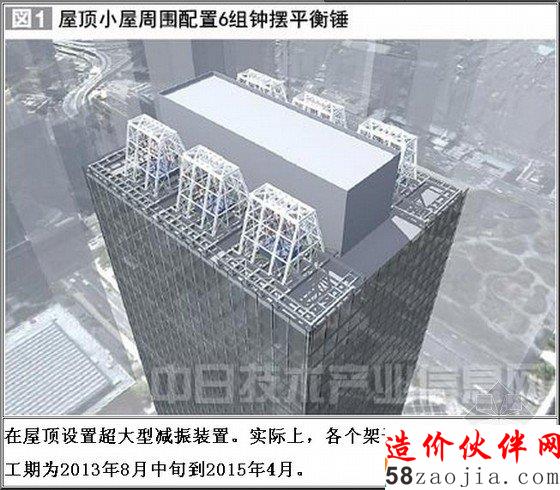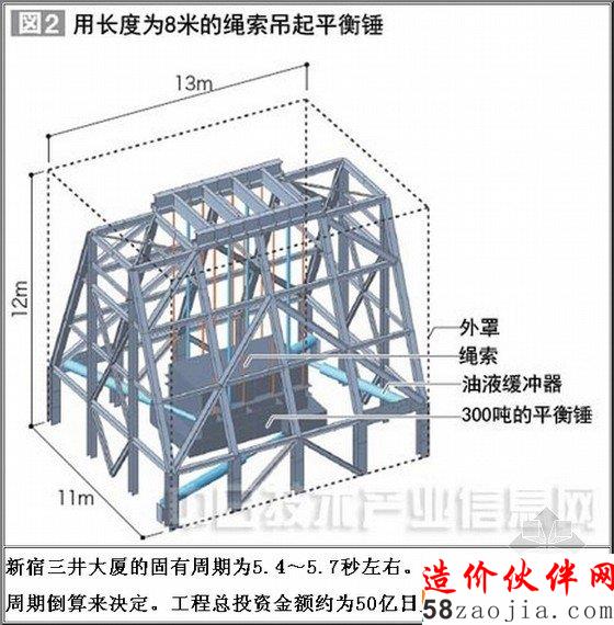 两公司将在55层高的大厦屋顶上,安装合计重量为1800吨、相当于整栋建筑重量约3%的平衡锤。通过搭建6组钢结构架子,分别用长8米的钢制绳索吊起300吨的平衡锤(图2)。平衡锤的最大摆幅约为2米,可朝任意方向自由摆动。平衡锤的周围安装有油液缓冲器,当发生超出设计范围的地震时,可以使平衡锤平稳减速,防止造成过大的变形和损坏。