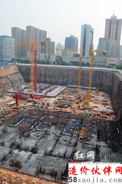 9月14日上午,记者从解放西路旁的高楼俯瞰:在11个足球场那么大、深达40多米的基坑内,塔吊林立,工程车辆来回穿梭,施工正如火如荼进行。靠近蔡锷路一侧的2号塔楼底板已经完工,靠近解放西路的1号塔楼正在紧张地进行底板混凝土浇筑。