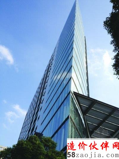 广场正中建有一个市民广场,上面绿草如茵,南北侧各有一栋高矮不一的楼,B座楼居南,显得有些矮小,A座楼居北,高大别致。记者面北而立,记者面前的大楼立面不是一堵墙,而是“一条线”,即由大楼前后两面幕墙绕过来,收缩成一条线。而这条线是两侧蓝色幕墙玻璃绞合在一起形成的,“合龙处”宽不过两三厘米,整体来看,如同开过刃的利剑,从空中直劈下来。而观其两侧,墙壁由薄到厚,延伸至北侧宽约几十米,中间呈弧形,整体形状若斧头。