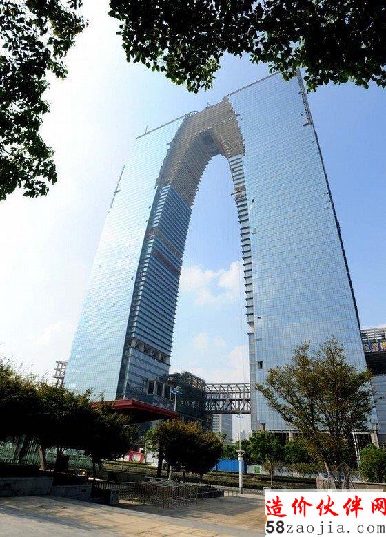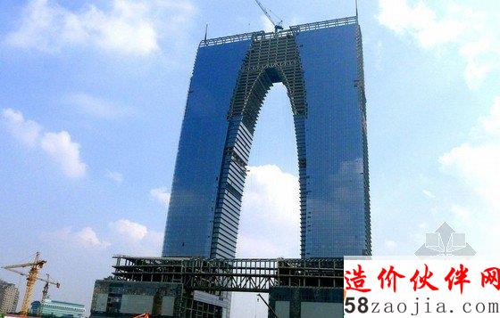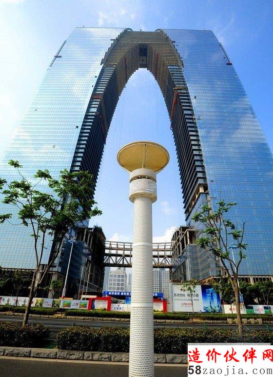 据悉,矗立于苏州工业园区金鸡湖西岸、气势恢宏的“东方之门”,相当于法国凯旋门的6倍,被誉为“世界第一门”,总高度为301.8米,其幕墙规格近百种共需16万立方米,平铺占地面积约有15个标准足球场大,该工程预计2014年底整体完工。