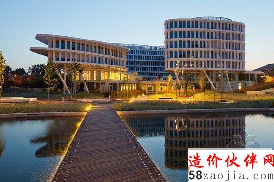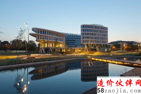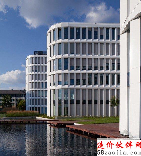 这是由fuksas工作室设计的warsaw商务花园酒店,位于波兰华沙的国际机场附近。该建筑是集住宿、办公、零售以及餐饮等为一体的多功能混合型上午酒店,其内共有206个房间,分为5个级别。另外,宽敞的现场会议中心,可以同时容纳800人该酒店位于一条城市的主要交通公路旁,在大楼的后部正对着一个广阔的花园,花园内设有绿色的露台,露台是一个室外餐厅。在建筑的地下一层,为一个灵活的立体车库,建筑外为一个人工湖,这个湖将建筑包围起来,每到傍晚,建筑内部以及湖岸边不同颜色的灯光照射出来,使建筑与湖面融为一体。该地区成了顾客赏玩的好去处。