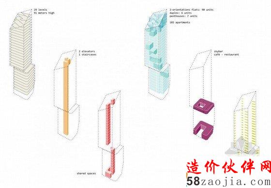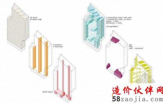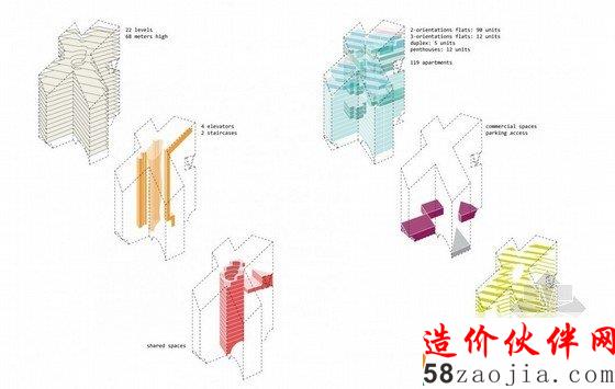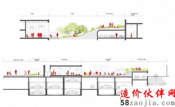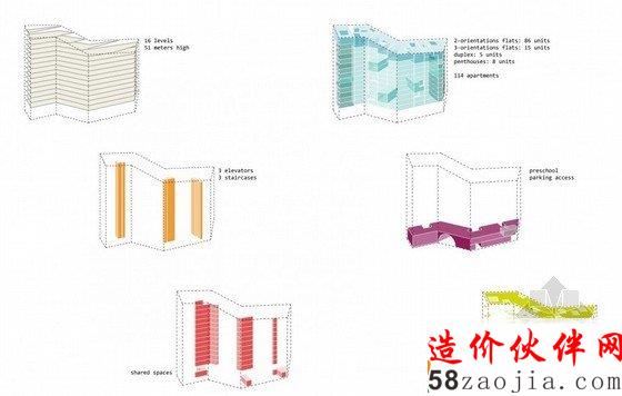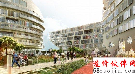 这是由Louis Paillard设计的Marievik,15方案,该设计位于瑞典首都西南的一个站点,占地65000平方米,集住宅,零售,餐馆,学校于一身。根据建筑师所说:Stockholm (瑞典首都)是一个基于“公共空间,共享空间,公园和花园”而建立的城市,因此导致他们的设计“扭曲而变成空白”。住宅部分的建筑风格包括双重视角,一些民居延伸至两到三个楼层,但是都能接触到户外空间。这些户外空间被改编,以利用他们的位置采光和风,同时也考虑到了噪音的问题。因此凉廊,阳台,冬季花园,天井和梯田被连接在一起。不管该项目的高密度,只有19%的部分才建造。其余的自由空间将被建成景观以及娱乐区域,咖啡馆露台,循环路线,街道家具和花园。六条路线蜿蜒穿过开放空间,既能容纳行人,也能容纳车辆。