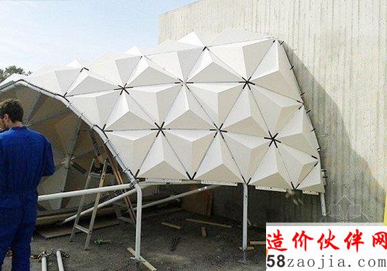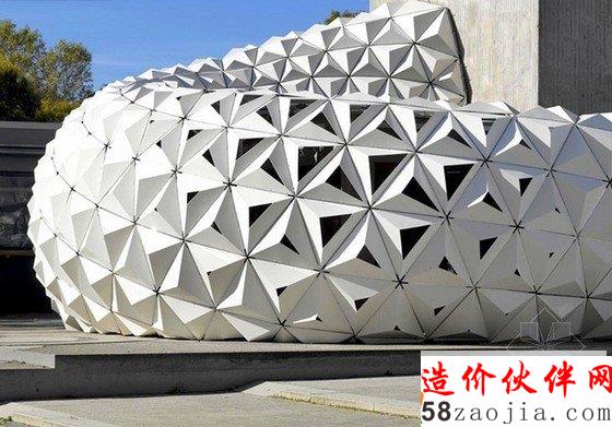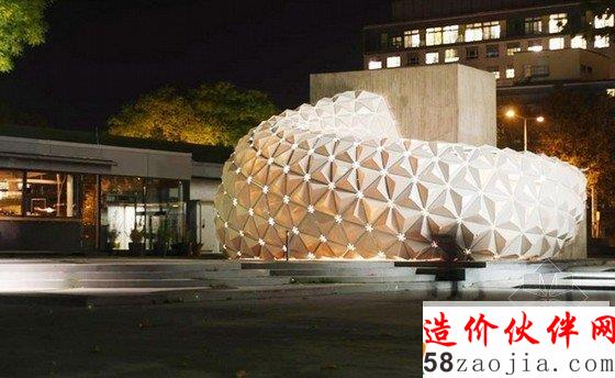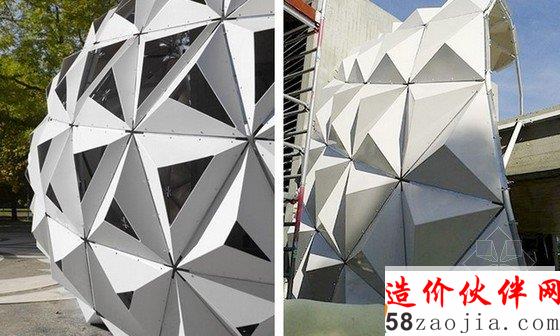 作为学院Bioplastic Façade研究项目的一部分,该设计显示了生物塑料在审美和结构上的潜力。该馆最近在德国一个重要的创新比赛中获奖。在该设计的蓝图中底层是由不同大小的三角形网状结构组成的。表层是由3.5毫米厚的生物塑料金字塔做成的,创造了一种自由曲面造型。这些生物塑料能被自由塑形来适合各种建筑外观的需要。这些生物塑料的挤压技术是与Bauer Thermoforming的合作来完成的,他是处理这一技术的专家。CNC milling (数控铣削过程中)产生的垃圾废物能够再利用。ITKE设计的ArboSkin馆在著名的国家竞赛中获奖。生物塑料到目前为止一直被用于包装,但是ITKE希望能够在他的新设计中使用生物塑料来代替水泥,因为水泥的生产会产生二氧化碳污染物。这种高度灵活的材料可以满足不同设计,不同形状的要求,并且是可降解的,是理想室内和室外材料。
