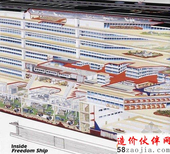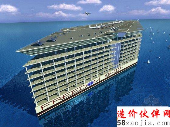 这艘Freedom Ship(自由之船)预计在三年内建成。它可一直漂浮在海上,分为25层,可供5万人居住,学校、医院、公园、机场等设施齐全。