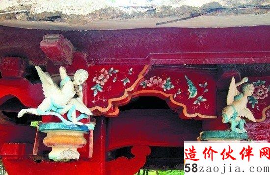 穿过门楼来到府文庙广场,在蔡清祠东侧的绿化带上,记者看到了泮宫门楼旧屋顶,旧屋顶被置于一米多高的底座上,四周围有两道铁栅栏保护着。虽然旧屋顶上的红色木梁和彩绘图案已掉漆,展翅的“小天使”构件也颇具沧桑感,但正是这古朴的质感和韵味,将其与周围的红砖古厝融为一体,成为府文庙广场的一个新景点。