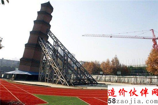 在西安市西光中学的操场上,记者看到这座建于明代万历年间的古塔,周边已被施工方用木板进行围挡,为确保西光中学师生的安全,塔身四周皆用钢架支撑和保护,可以看到古塔的倾斜角度已经开始变小。“古塔扶正工作已经有两个月的时间了”。施工方的工人告诉记者。