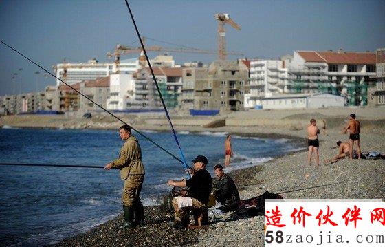 人们从施工现场的伊梅列季谷在俄罗斯黑海度假胜地索契的奥运村附近的海岸钓鱼。