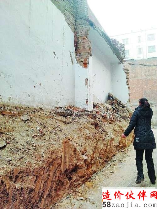 “你看看现在的情况,俺家周围都被开发商挖开,房子就像坐在悬崖边上一样。”1月14日上午,记者在张春香的引领下来到现场。顺着张春香手指的方向,记者注意到,这是一栋砖瓦结构的老房子,南侧墙体已被破坏,出现许多裂缝,墙基也多处暴露在外。老房子南侧、紧挨房子墙基的地方是一条新挖的土路,比地平面低了近3米,看起来更像是一条深沟。