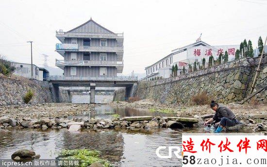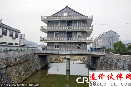 2013年1月22日下午,浙江温岭市温峤镇梅溪村的泄洪道上,一栋豪华型的三层别墅楼屹立在桥的中间。