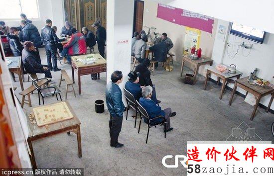 2013年1月22日,浙江温岭温峤镇梅溪村,村民们在桥上房子打牌看电视。