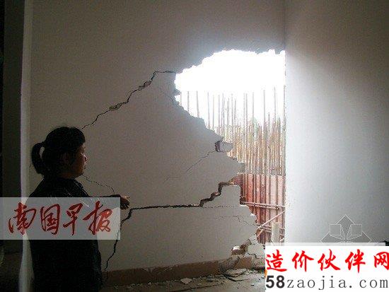 3月25日下午,记者来到中秀路居民家,这是一栋3层半的楼房,共有30多间房屋,位于建筑工地的西面,相距不到1米远。一楼紧靠工地的两间后屋,有一面墙倒塌了一半,还有一面墙已完全倒塌,几根铁杆支撑着二楼的天花板,罗女士称这两堵墙倒塌于3月14日,施工方担心整栋楼坍塌,所以用铁杆支撑住。