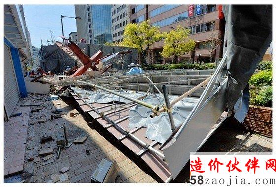 据目击者透露,自己是在附近工作,当时看到遮盖脚手架的遮布在摇晃的时候,只听“哐啷”一声脚手架一下子全都塌落下来了,一