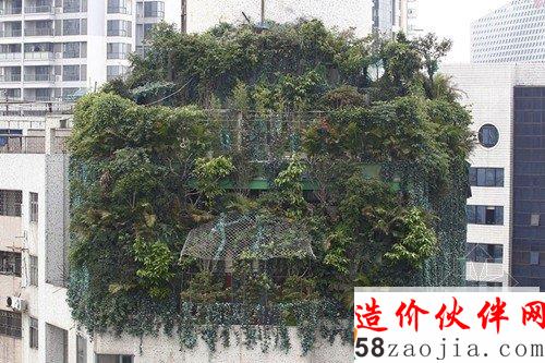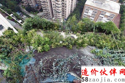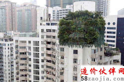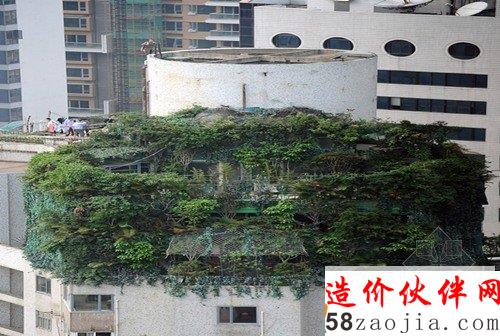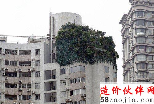 2014年4月9日,广州,林和东路海棠阁小区东座顶层3层楼被业主搭建成“原始森林”,疑似违章建筑。