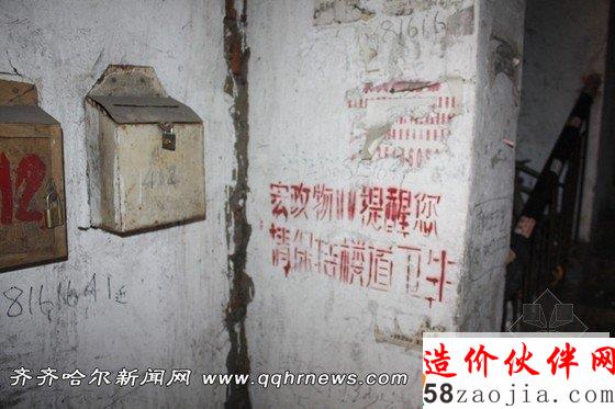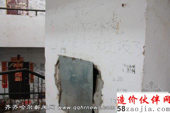 记者在楼梯柱子上看到,有居民忍受不了垃圾遍地的环境,在墙上写着“为了我们自己的环境,请您不要再扔垃圾了!”而在楼门口的墙上,则有物业公司喷着提示语:宏政物业提醒您,请保持楼道卫生。