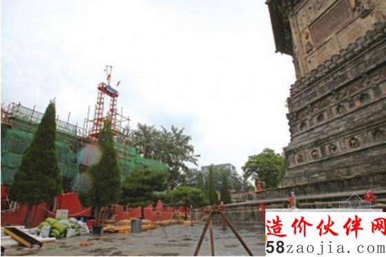 昨天上午10点多,900多岁的天宁寺塔笼罩在烟雨之中。塔后一栋中间三层两侧四层的楼房已接近封顶,脚手架上仍有工人在冒雨赶工。一楼附近还残存着一排平房的门脸儿。