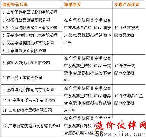根据国家电网公司电子商务平台——不良行为处理业务公告,整理被国家电网通报处罚的12家10千伏配电变压器企业如下: