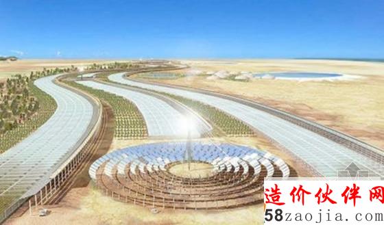 撒哈拉森林计划就是将这一原理放大执行。蒸发的海水形成的水汽,或者是从海岸抽取的海水将会弥散在空气中,悬浮在温室的四周,为生长的作物提供一个湿润的生存环境;蒸发的海水遗留下来的盐分将凝结在温室后面的暗灰色管子上。在温室的边缘,布满了高密度的太阳能板,也就是用蒸馏过的水清洗的大镜子来吸收太阳光。这集中起来的热量将被用来加热水,使其变为水蒸气,来带动涡轮机的运作,以此发电。这个系统不仅能够生成这个温室所需水量的五倍,而且相当于其他太阳能工厂生产能量产出的两倍。