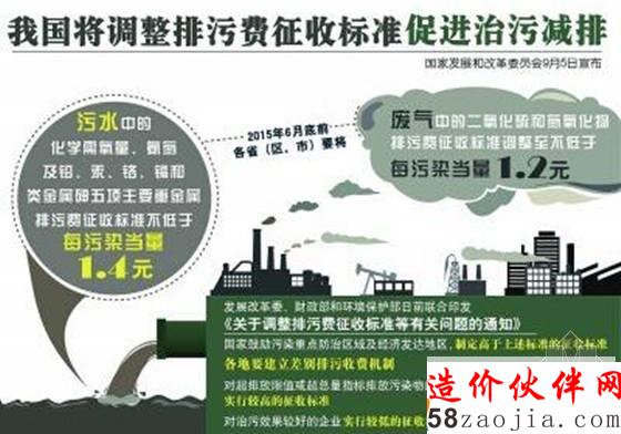 在2015年6月底前,各省(区、市)价格、财政和环保部门要将废气中的二氧化硫和氮氧化物排污费征收标准调整至不低于每污染当量1.2元,将污水中的化学需氧量、氨氮和五项主要重金属(铅、汞、铬、镉、类金属砷)污染物排污费征收标准调整至不低于每污染当量1.4元。