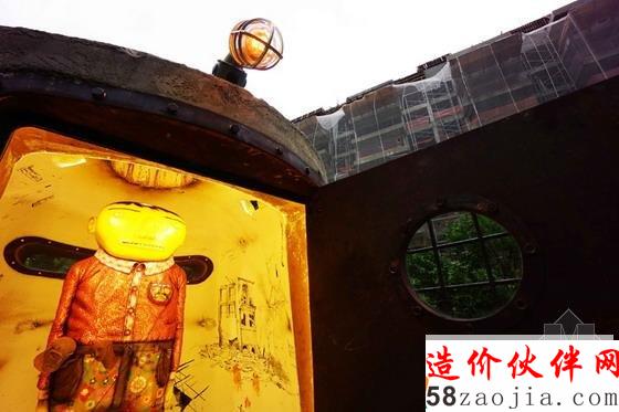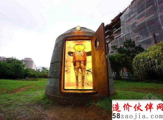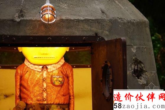 在这个混凝土外壳内是一个寻常大小的Os Gemeos典型造型,其外层黄色、色彩鲜艳。它位于一个温暖空间的中心,周围是各种版图和图案。两面窗户——一面前方是圆形的,另一面长长的后面却很窄。门一关,行人就能凝视一切。由于其军事化设计,此“碉堡”保护了这些艺术品同时成为了博物馆中一个新的雕塑。