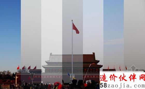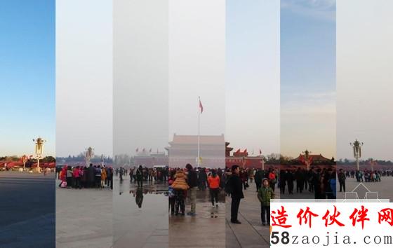 从2015年2月18日到2015年2月24日(画面从左至右),记者每日拍摄天安门广场、天安门城楼、人民大会堂和国家大剧院,记录了北京春节七天长假空气质量变化。根据环保部数据中心提供的北京市空气质量分析日报,春节七天长假,北京两天空气质量指数为良,三天空气质量指数为中度污染,一天空气质量指数为重度污染,一天空气质量指数为严重污染。