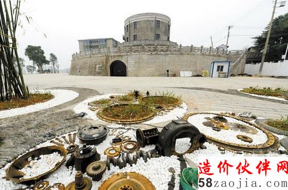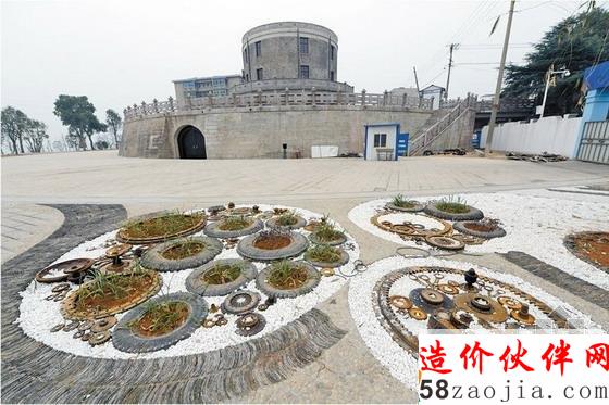 从施工围挡旁的一条小路进入潭宝汽车站广场,首先映入眼帘的,就是那由数个废弃轮胎和汽车零部件组合而成的广场景观。除了布满各式各样的汽车配件外,有心的设计人员还在每个轮胎中间种上了花草,并在附近栽下了竹子等植物。