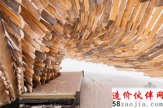 深受好评的墨西哥公司rojkind arquitectos受邀建造了一个装置以补充其他入选方案。这个名为“混合小屋”的综合木质结构鼓励滑雪者和行人俯身进入其中,在这里保暖。