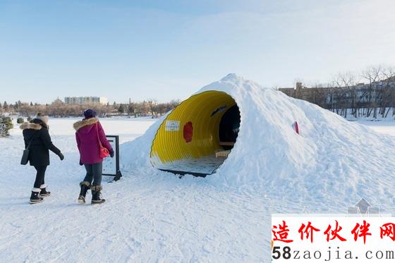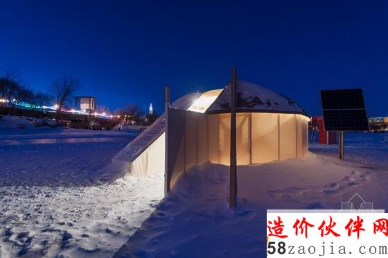 利用单向镜和磨光不锈钢板的理念,“镜面板”被设计成了冬日景观的一部分。这个由马尼托巴大学完成的项目的理念是通过封闭式结构让游客在开阔空间内找到某种温暖。