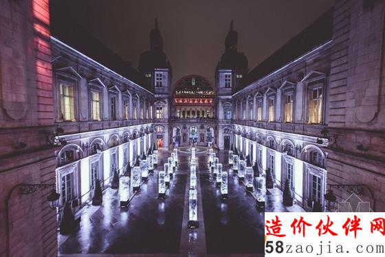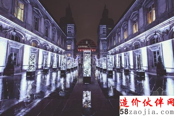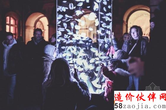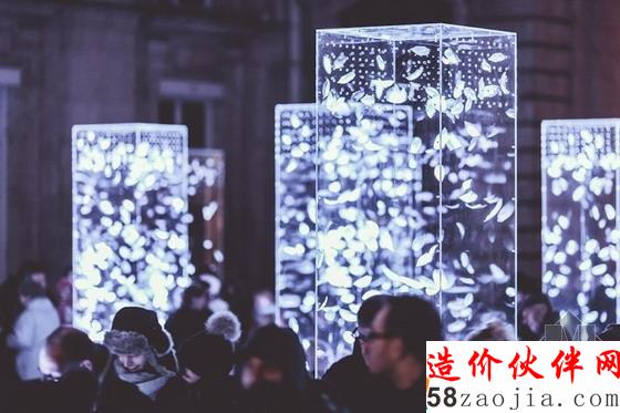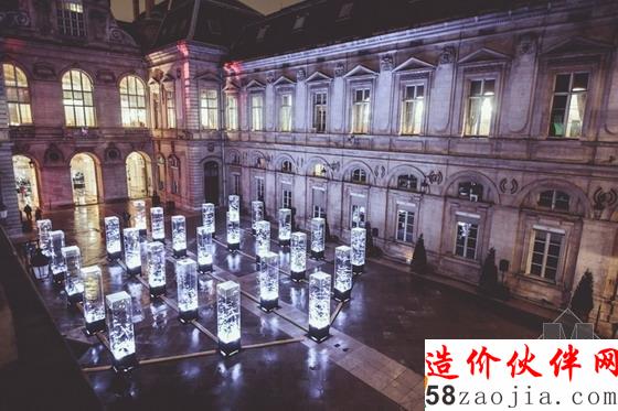 这个装置是为了里昂灯光节设计的,它包含26根有机玻璃材料柱,每跟柱子上都有发光二极管、风扇和上百种图形。受尼约德(分配财富之神)的影响,市政大厅的这块区域被改造成了一个充满神话气息的现代空间。当这些光柱图案变化的时候会出现身临其境的配乐。