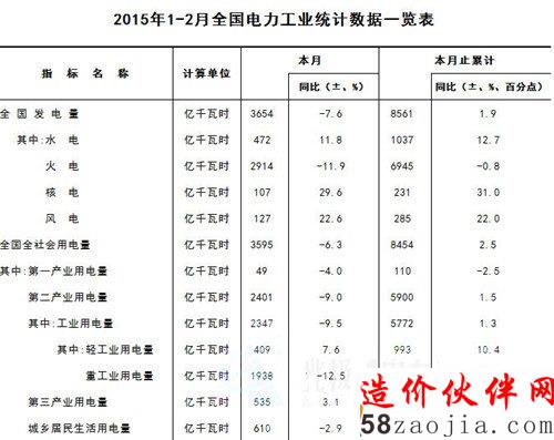 近日中电联规划与统计信息部公布2015年1-2月全国电力工业统计数据一览表: