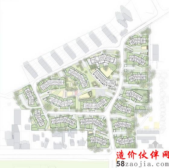 这17栋新建的公寓呈现一个“急转弯”形状,这使得这片住宅区达到了最大的空间差异同时重复了在经济上可行的建筑元素。公寓在角度和位置上的转换创造了一个建筑和户外空间的多元化集团,这使得这些上世纪五十年代的结构的自由流动空间得到了升级。从西-北到东-南,有一列大型户外游乐场、社区空间和开放空间。这个区域将南边的一个小型公园和北边的一大片区域与这片城市空间连接着。