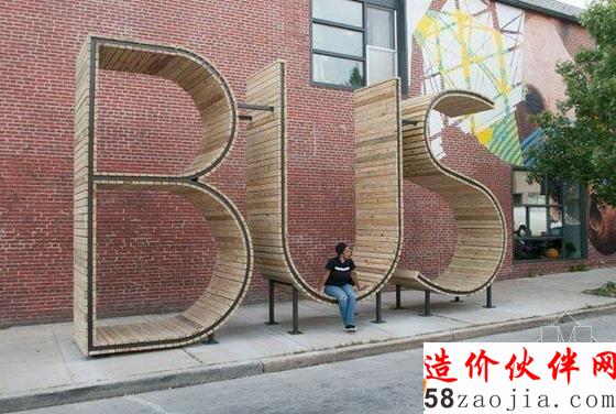 Water Geiger设计了这些白色、曲线型的纤维加强型聚合板,把艺术带入到公共空间里,同时也为公交乘客提供急需的阴凉地。其他创意性设计包括太阳能电池板和绿色屋顶结合而成的遮蓬,或是其他显著的设计如马德里艺术家联盟Mmmm在巴尔的摩Highlandtown社区东南大道上设计的车站,那里的车站结构是14英尺高、7英尺宽的“BUS”字母。