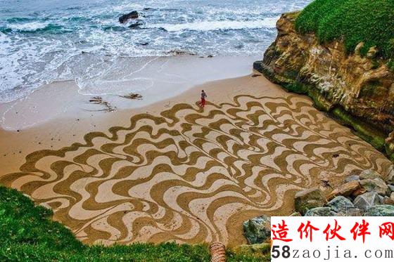 旧金山艺术家安德烈阿马多以在落潮时期的沙滩上创造漂亮的沙画作品而闻名。阿马多的沙画面积高达十万平方英尺,为了获得各种各样的图形,他用绳子作为图形导向、用耙子松动湿沙子来创作。