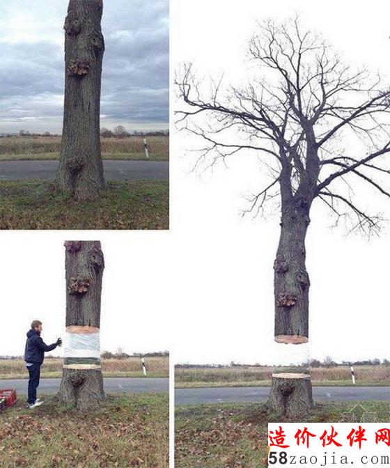 美术设计师希尔林(Daniel Siering)与艺术总监舒斯特(Mario Schuster) 合作创造了横穿树干中部的德国乡村景观,给人一种树被砍断的幻觉。这种欺骗的行为只是简单的在树上包裹塑料布、喷绘背景景观,再加上两分的树干就获得了这种效果。