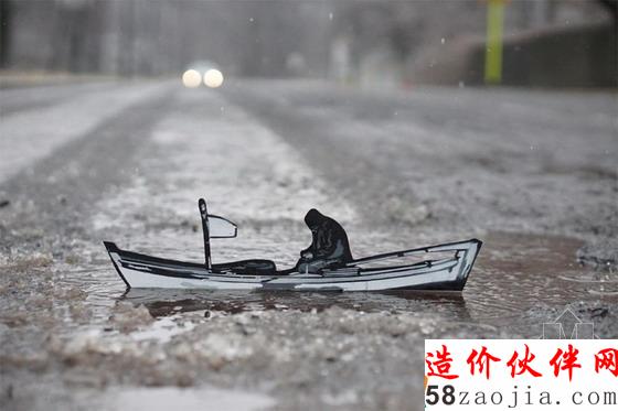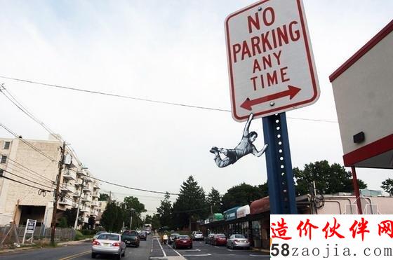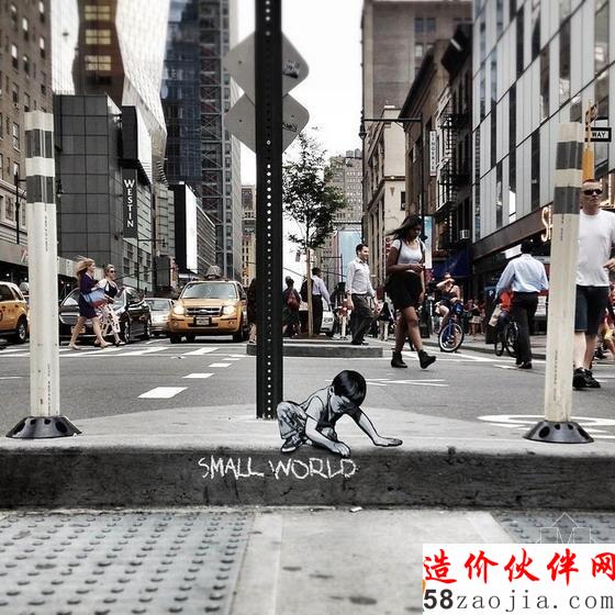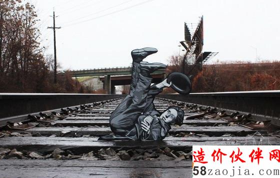 这些形象被定点摆放,它们利用周围环境完成了形象的描述。例如:一个水坑就像一个水池,一个男人庄重地坐在水上的船只上;提着手提箱、背着背包的探险者走在铁路线上;一个小男孩在一条过道边涂鸦着“小世界”几个字。每个模板印组合都包括喷漆和一个木制图案,从而为每一个形象都刻画出了纹理和造型。正在进行的系列项目是融合到纽约城市街道和海滨景观中的改造,它旨在以这种方式讲述每个人在他们周围环境下的日常生活。