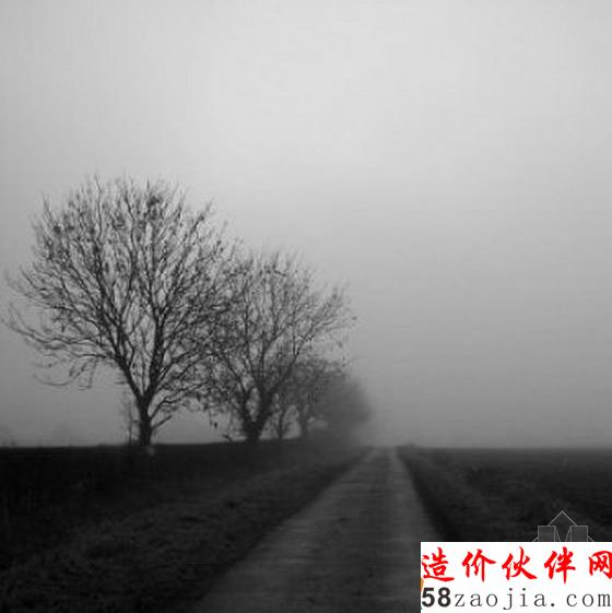 浓雾弥漫着乡村小道,阴暗的气氛营造出一种孤独寂寞感觉,前方未知,未来未知。