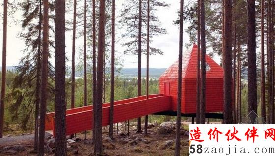 这个旅馆矗立在河谷上方,看起来就像林海中的一支小船。M rten and Gustav Cyrén在一次俄罗斯森林钓鱼之行结束后设计了这个房子。穿过林间的小桥便可到达房间,每个房间的床都在正中间,所以每天早上醒来第一眼都是房间全景。