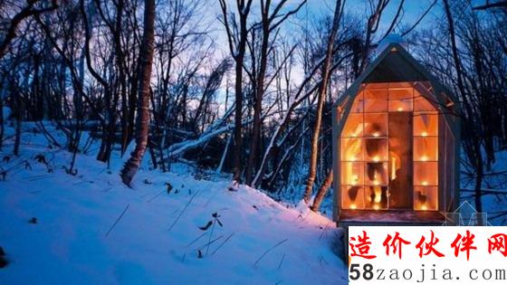 Hidemi Nishida工作室设计的这个小屋,只要灯亮起来,就给人一种在寒冷中温暖的感觉,有种仿佛它在邀请你的感觉。事实上,这座森林深处的小屋就是给疲累的旅行者提供休息之地的。
