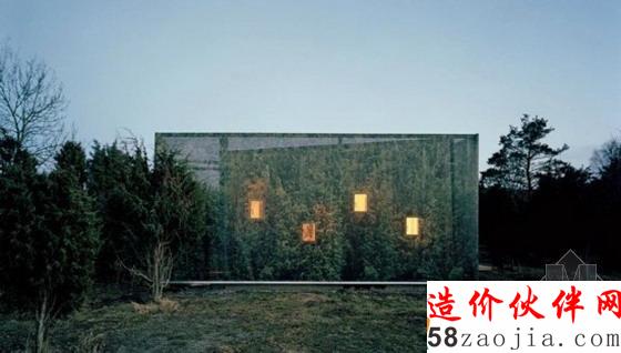 这座房子四面墙由玻璃制成,白天可以让人沐浴在阳光中。其本身坐落在湖边,当夜幕降临时就会看见一个漂亮的灯笼在湖边闪耀。