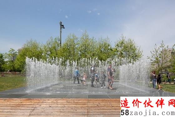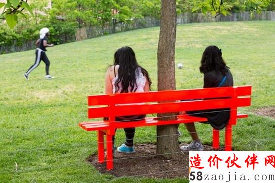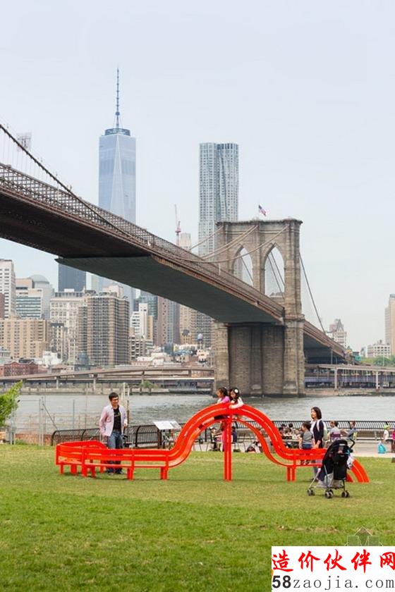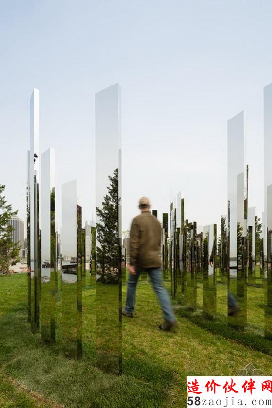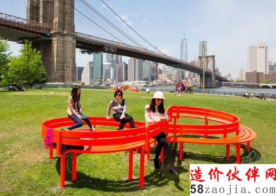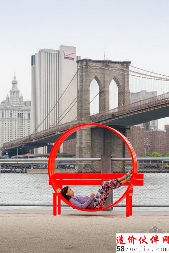 “运用镜面抛光不锈钢制成等距间隔立柱,Hein已经创造了一种三个辐射弧线的迷宫来改变游客的观念,他们看到交替节奏物理空间和镜像空间“公共艺术基金组织说。该空间是在两米高的喷泉水柱墙,游客可以站在里面不会被弄湿。“这些墙壁会系统地出现和消失,通过定时循环,吸引游客跨上平台和在空间雕塑中移动。”Hein创造了16雕塑,包括鲜艳的橙色公园长凳展览。