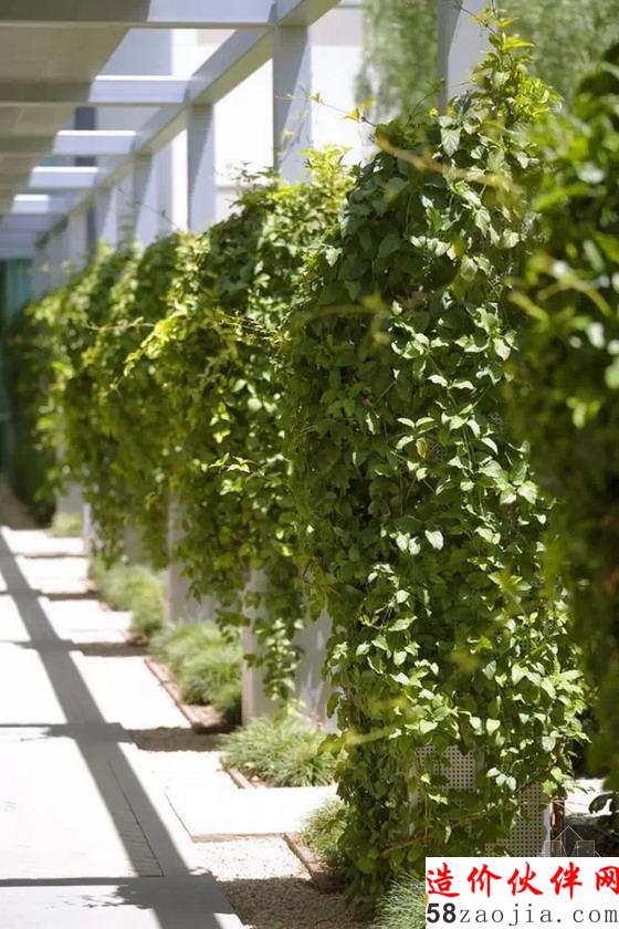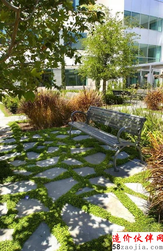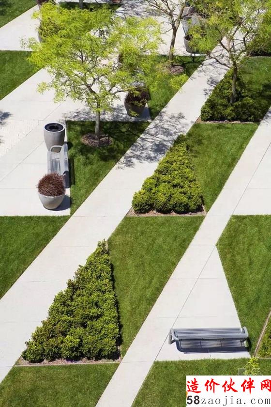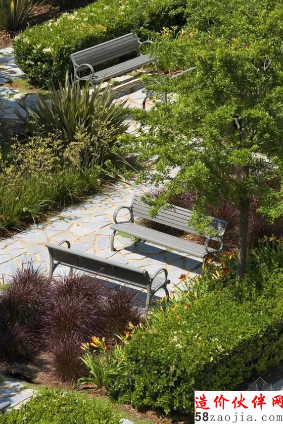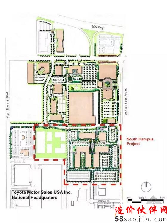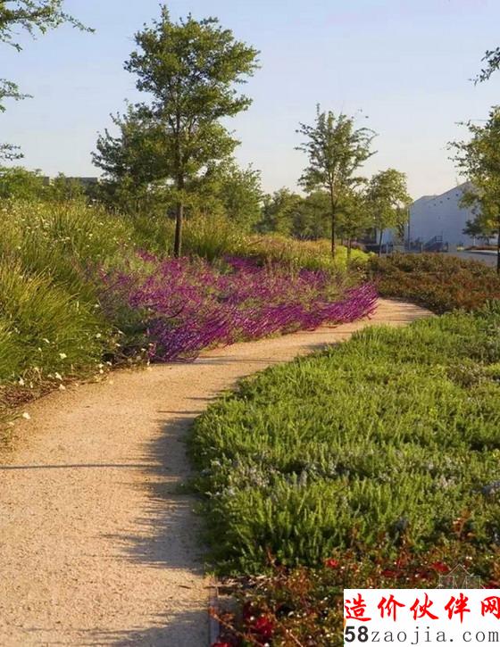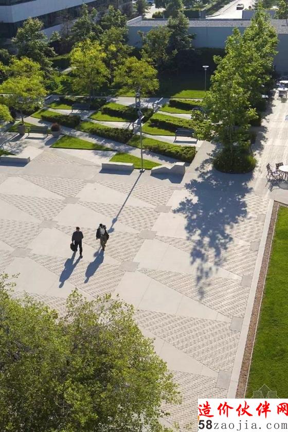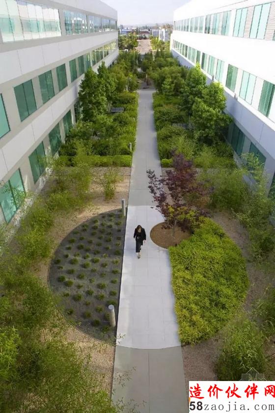 主庭院内几何形的景观和铺装形式营造了一个小型室外生态区。喷砂混凝土和预铸混凝土铺路机的使用营造了集会空间的纹理和颜色,这个引人注目的空间可以容纳全体员工。这个穿插着步行道的庭院充满了茂盛的海岸栎和鸡子木。葡萄藤墙营造了有趣的光影和纹理。耐旱植物提供了独一无二的地中海氛围。主题花园里的小型座椅使人完全脱离了办公环境,置身大自然。日式花园彰显了丰田的起源。一条风化花岗岩散步道效仿了森林牧场。回收的碎混凝土用作装饰性铺装体现了项目的可持续理念。几何纹理的入口广场增添了色彩和质感。