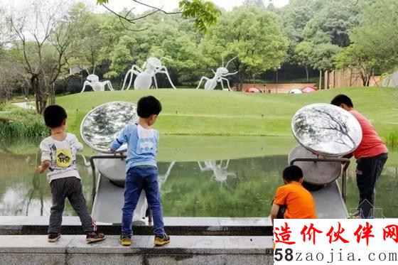 公园面积只有1.4公顷,但是要满足各类人群的不同使用需求。场地本身标高比四周低,而且有大片的原有山林和一个池塘。设计方案在尽量保护植被和满足人们使用要求的基础上,巧妙的将雨洪管理系统融入场地,在使用生态手段处理雨洪的同时,使人们可以与这个系统进行互动,在玩耍的同时,学习与雨洪相关的知识。此外,方案还将“大昆虫”的主题引入儿童活动区,设计并制作了各种以昆虫形态为灵感的互动雕塑和游乐设施,让前来玩耍的孩子们留下美好的回忆。