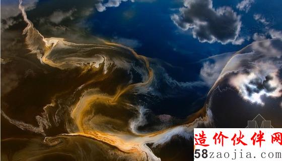 刚开始看时会容易让人误以为这是抽象的油画,但事实上这个图片给人巨大的警示。麦克默里堡当地盛产石油。为了产出一桶159升的原油,需要提取出2吨泥炭以及2吨沙子。生产石油所获得的利润使当地的人口激增,然而这是以污染环境为代价的。