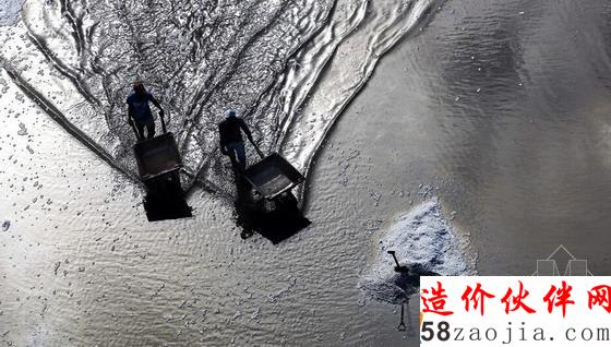在加勒比海上的多米尼加奥克亚湾里,人们进行着让海盐脱水的工作。