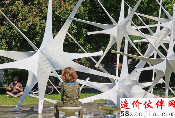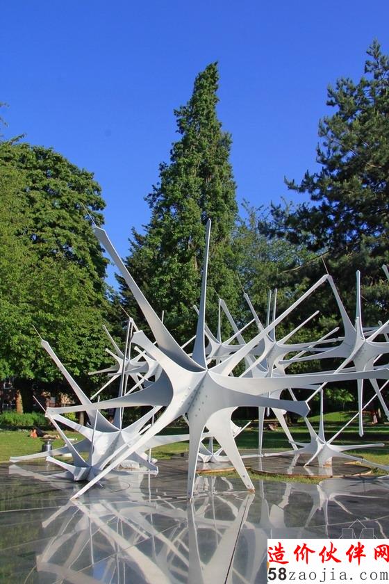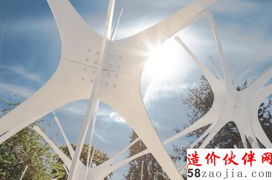 设计细节:最终场馆的成品是一个量大约4米高,62m面积的作品,其构造主要由不锈钢复合固体钢体和钢结构与碳钢的支撑核心。整个设计重约2004公斤,“主星”重60公斤和“卫星”重27公斤;所有的“星”通过一个锁链连接并通过地基的面板系统创造出了一个有趣的演示环境和其镜像平台外观。