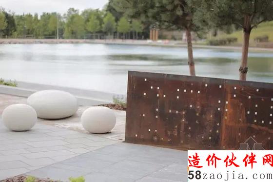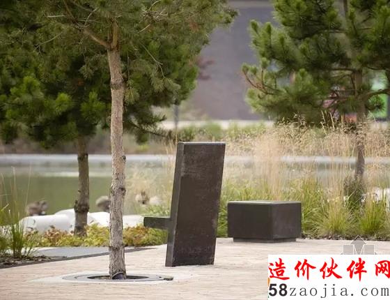 采用了粘土砖和锈蚀钢板等具有工业化特性的材料作为艺术小品