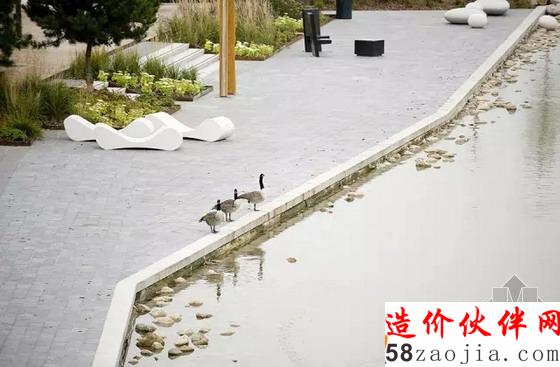 绿地中心是一个扇形的水池,沿着湖岸布置了象棋和滚球的活动区域。直线型的驳岸边缘摆放了许多原石,鼓励人们沿水岸散步和休息的同时也进行亲水活动。植物方面,景观设计师大量采用了有助于当地野生动物生存其中的原生植物,水池边缘也精心布置了水生植物。鉴于当地过去工业化的历史,在如今的工业化阶段,采用了粘土砖和锈蚀钢板等具有工业化特性的材料作为艺术小品。