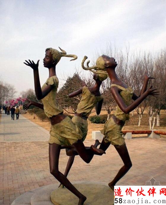 三位少女衣袂飘动,发辫飞舞,左腿相搭,右腿弹跳,生动地再现了边唱边跳“编花篮”游戏的场面。